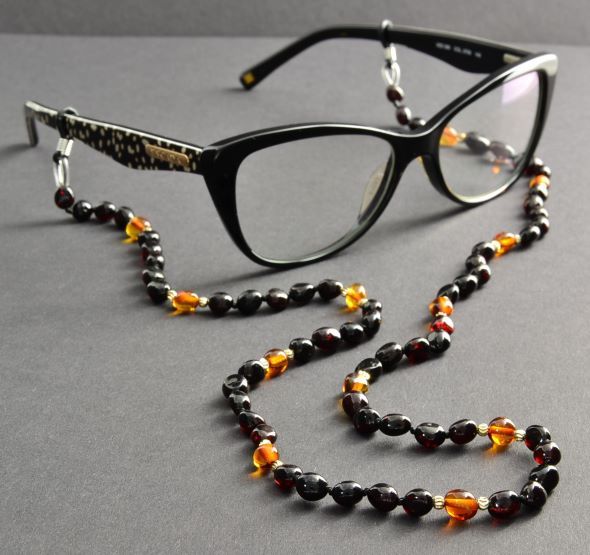 Keep your sunglasses stylishly and secure with Unique, Healing Amber Glasses chain holder. Made of natural Amber adorned with Sterling Silver spacers.