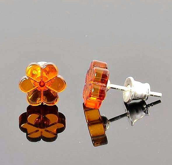 Flower Amber Stud Earrings Made of Cognac Color Amber